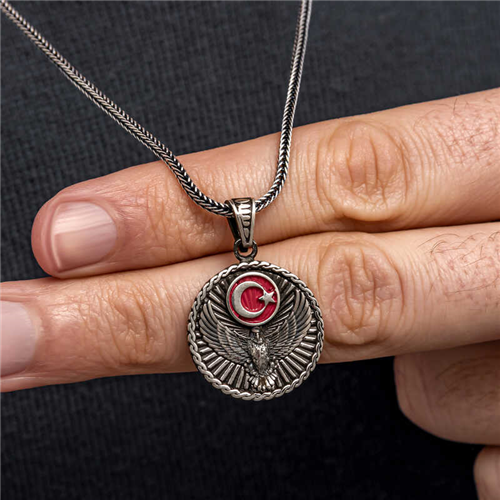 Silver Crescent Star and Eagle Men's Necklace The crescent star represents the crescent and star motif on the flag of Türkiye. This symbol symbolizes the independence, freedom and national identity of the Turkish nation. The eagle is the symbol of power, freedom and pride. It also has an important place in Turkish mythology. The eagle, as a bird looking up and flying at high altitude, represents determination and success. The crescent star and eagle necklace symbolizes the sense of unity and solidarity of the Turkish nation. This stylish necklace; You can choose it as a birthday gift, Valentine's Day gift or a gift on special occasions. Oxidized silver is coated. Oxidized silver necklaces preserve their shine for a long time. As with all necklaces, this silver crescent star eagle necklace is also entirely handmade. Due to silver and precious stones, there may be ± 10% deviation in the average product weight. Width: 2.00 cm Length: 3.00 cm Chain Length: 55 cm Average Weight: 16.00 gr.