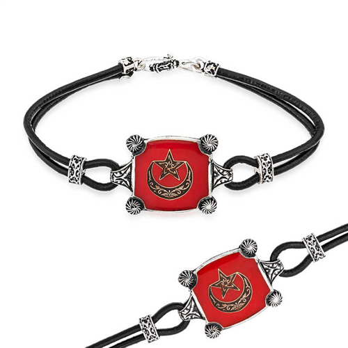 Silver Crescent and Star Men's BraceletCrescent and star or crescent-star; ancient symbol consisting of a crescent and a star at the open end of the crescent. Flags featuring this symbol are mostly found around the Mediterranean, in the Middle East, and in Central Asia. Today, it is known as a symbol mostly used on the flags of Islamic countries. The crescent and star symbol appears on many flags, including the Turkish flag. Although the crescent moon or crescent is identified with Islam, it was also used in pre-Islamic times; the crescent, star, and sun motifs have existed throughout history in the pantheon of America, Europe, Anatolia, the Middle East, and Central Asia. Inspired by history, this specially designed red enameled men's bracelet with leather cord is made of 925 sterling silver. The silver crescent and star men's bracelet has an oxidized coating. The oxidized coating gives the silver a black, aged appearance. The silver crescent and star men's bracelet will be one of the most beautiful gifts that you and your loved ones will enjoy wearing. As with all our silver jewelry models, the silver crescent and star men's bracelet is handmade. Due to silver and precious stones, there may be a ±10% deviation from the stated product weight.Width: 3.50 cmHeight: 2.20 cmAverage Weight: 14.00 gr.