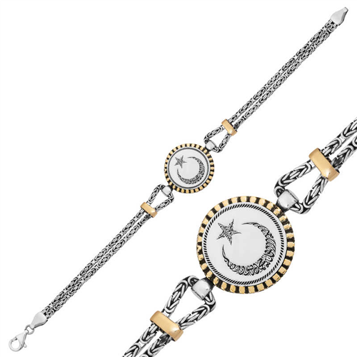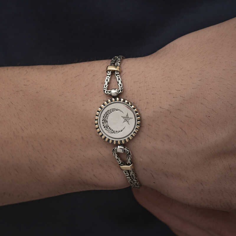 Silver Crescent and Star Men's BraceletWe know that the Turkish flag was inspired by the crescent and star reflected in a pool of blood. We offer you an unmissable opportunity to carry the sacred meaning of the flag on your wrists and share it with your loved ones. This stylish crescent and star bracelet model is made of 925 sterling silver. Oxidized silver is applied. Silver oxide coating gives the coated products a slight black color and an antique look. Crescent and Star Men's Bracelet is made of 925 sterling silver. Due to silver and precious stones, there may be a ±10% deviation from the average product weight.Width: 2.20 cmLength: 2.30 cmBracelet length: 21 cmAverage Weight: 19 g