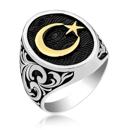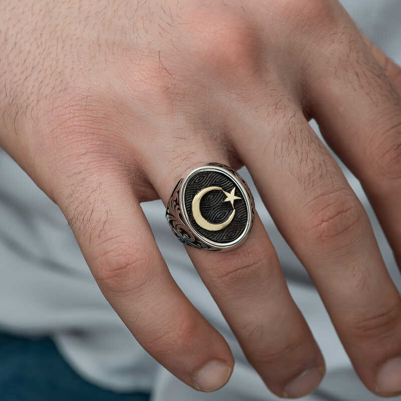 Silver Crescent and Star Men's Ring with Patterned Sides Crescent and star or crescent-star; ancient symbol consisting of a crescent and a star shape at the open end of the crescent. Flags featuring this symbol are mostly found around the Mediterranean, in the Middle East, and in Central Asia. Today, it is known as a symbol mostly used in the flags of Islamic countries. The Crescent and Star symbol appears on many flags, including the Turkish flag. Although the Moon or Crescent is identified with Islam, it was also used in pre-Islamic times; the Crescent, Star, and Sun motifs have existed throughout history in the pantheon of America, Europe, Anatolia, the Middle East, and Central Asia. Beginning in rock paintings dating back to 5000 BC in Central Asia and similarly depicted on later shaman drums, the Crescent, Star, and Sun motifs offer insights into the universe design of the Asian Turkic-Mongol peoples. However, the first documents depicting the Crescent and Star together appeared in the Sumerian cities of Mesopotamia, in what is now Southern Iraq. The first use of the Crescent and Star motif, which clearly consists of a crescent, was made by the Sumerians. The Sumerians established the first state in history in Southern Iraq in 3000 BC, representing a major step in the construction of today's civilization. They threw them. The Sumerian language was very close to Turkish. Their beliefs were largely similar to those of the Turks. The symbols of the Sumerian Moon God "Nana-Suen" and the Sun God "Utu" or the Goddess Inana were shown together, creating the first Crescent-Star duality. This motif is sometimes carved in stone reliefs, sometimes in seals, and sometimes on clay tablets and has survived to this day. Inspired by history, this men's ring with patterned crescent stars on the sides can be a gift to yourself or your loved ones on birthdays, Father's Day, or special occasions. This stylish men's ring is made of 925 sterling silver. The silver is oxidized. Oxidized rings have an authentic look. Like all men's rings, the crescent-star men's ring with patterned sides is also hand-made. Due to silver and precious stones, there may be a ± 10% deviation from the stated average product weight. Width: 2.00 cm Height: 2.20 cm Average Weight: 13.90 gr.