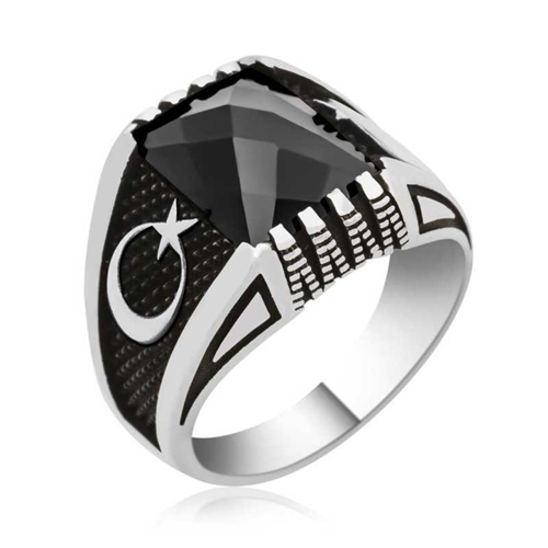 Silver Moon Star Men's RingWe know that the Turkish flag was inspired by the crescent and star reflected in the blood lake. We offer you an unmissable opportunity to carry the sacred meaning of the flag around your neck and share it with your loved ones. You can gift this stylish design ring to yourself or your loved ones on your birthday, Father's Day or on special days. The crescent star men's ring is made of 925 sterling silver. Oxidized coating is applied on the silver. Oxide-coated silver men's ring models achieve an authentic appearance and delay tarnishing. The stone on them is zircon. As with all silver men's rings, the silver and black zircon crescent star men's ring model is also produced entirely by hand. Due to the silver and precious stones, the average product weight is ± There may be a 10% deviation. Width: 1.00 cmHeight: 1.50 cmWeight: 8.50 gr.