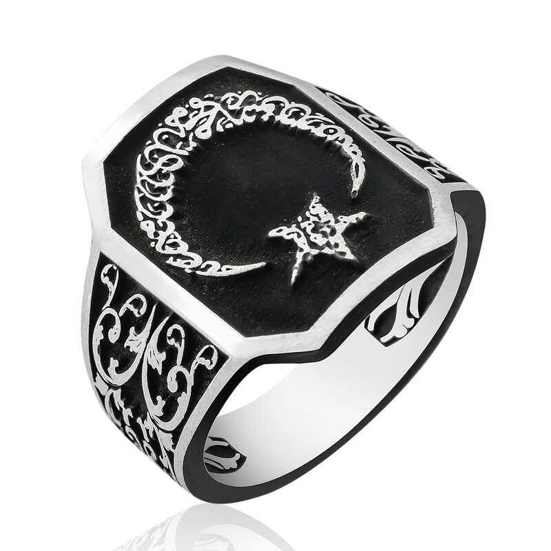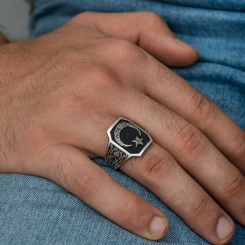 Silver Crescent Star Men's RingCrescent and star or crescent-star; ancient symbol consisting of a crescent and a star at the open end of the crescent. Flags featuring this symbol are mostly found around the Mediterranean, in the Middle East, and in Central Asia. Today, it is known as a symbol mostly used in the flags of Islamic countries. The Crescent and Star symbol appears on many flags, including the Turkish flag. Although the Moon or Crescent is identified with Islam, it was also used in pre-Islamic times. The Crescent, Star, and Sun motifs provide information about the universe design of the Asian Turkic-Mongol peoples. However, the first documents depicting the Moon and Star together appeared in the Sumerian cities of Mesopotamia, in what is now Southern Iraq. The first use of the Crescent and Star motif, which clearly consists of a crescent, was made by the Sumerians. The Sumerians established the first state in history in Southern Iraq in 3000 BC and took a major step in the construction of today's civilization. The Sumerian language was very close to Turkish. Their beliefs were also largely similar to those of the Turks. The Sumerian Moon God "Nana-Suen" and the Sun God "Utu" or Goddess Inana's symbols were shown together, creating the first Crescent-Star pairing. This motif has survived to this day, sometimes carved in stone reliefs, sometimes on seals, and sometimes on clay tablets. You can choose this elegant ring as a birthday gift or Valentine's Day gift on special occasions. Silver crescent star men's ring is made of 925 sterling silver. Oxide coating is applied to the silver. Oxide-coated silver rings have an aged appearance. Due to silver and precious stones, there may be a ±10% deviation from the average product weight.Width: 1.80 cmLength: 2.00 cmAverage Weight: 10.50 gr.