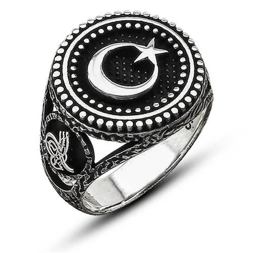Silver Crescent Star Men's Ring Crescent and star or crescent-star; ancient symbol consisting of a crescent and a star at the open end of the crescent. Flags featuring this symbol are mostly found around the Mediterranean, in the Middle East, and in Central Asia. Today, it is known as a symbol mostly used in the flags of Islamic countries. The Crescent and Star symbol appears on many flags, including the Turkish flag. Although the Moon or Crescent is identified with Islam, it was also used in pre-Islamic times. The Crescent, Star, and Sun motifs provide information about the universe design of the Asian Turkic-Mongol peoples. However, the first documents depicting the Moon and Star together appeared in the Sumerian cities of Mesopotamia, in what is now Southern Iraq. The first use of the Crescent and Star motif, which clearly consists of a crescent, was made by the Sumerians. The Sumerians established the first state in history in Southern Iraq in 3000 BC and took a major step in the construction of today's civilization. The Sumerian language was very close to Turkish. Their beliefs were also largely similar to those of the Turks. The Sumerian Moon God "Nana-Suen" and the Sun God "Utu" or Goddess Inana's symbols were shown together, creating the first Crescent-Star pairing. This motif has survived to this day, sometimes carved in stone reliefs, sometimes on seals, and sometimes on clay tablets. You can choose this elegant ring as a birthday gift or Valentine's Day gift on special occasions. Silver crescent star men's ring is made of 925 sterling silver. Silver is oxidized. Oxidized silver rings have an aged appearance. Due to silver and precious stones, there may be a ±10% deviation from the average product weight. Width: 2.30 cm Length: 2.60 cm Average Weight: 8.00 gr.