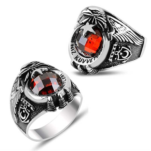 Silver Crescent Star Navy Red Stone Men's RingThis 925 sterling silver ring, specially designed for Navy officers and set with first-class workmanship, will be an accessory you will enjoy using. The Star and Crescent has Naval Forces written inside and zircon stones and the sides are adorned with the Naval Forces Command Coat of Arms. The ring is oxidized. Oxidized silver men's ring models gain an authentic appearance. All of our products are handmade. Due to silver and precious stones, there may be ± 10% deviation from the average product weight.Width: 2.20 cm Length: 2.50 cm Average Weight: 16 gr.