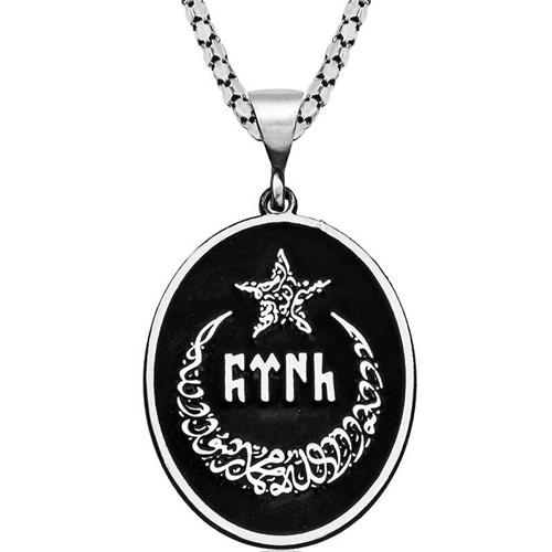 Silver Crescent Star Necklace with Gokturk Turkish Writing InsideThe Gokturks, or Gokturk Khaganate, is the first state established with the name "Turk" between 552 and 724. Turkish words were engraved on stones for the first time during this period. The word "Turk" was designed with the Gokturk alphabet in which it was used for the first time with the Crescent Star necklace. The necklace is made of 925 sterling silver. Oxide coating is applied on the silver. The oxide coating gives the silver an authentic look. As with other necklaces, the silver crescent star necklace with Gokturk Turkish writing inside is also handmade. Due to silver and precious stones, there may be ± 10% deviation from the average product weight. Width: 2.20 cm Length: 4.00 cm Avg. Weight: 10 gr. Average Chain Length: 55.00 cm.