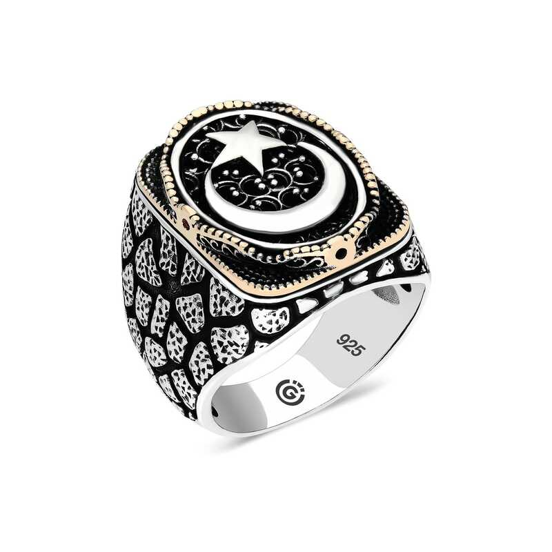 Silver Crescent Star Oval Men's Ring The crescent star oval men's ring model on silver is a stylish accessory that you can use at any time of the day. You can gift this ring to yourself or your loved ones on your birthday, Father's Day or special occasions. The crescent star oval men's ring model is made of 925 sterling silver. Oxide coating is applied to the silver. Oxide coating preserves its shine for a long time. As with all men's rings, the silver crescent star oval men's ring model is handmade. Due to silver and precious stones, there may be a ± 10% deviation from the average product weight.Width: 1.50 cmLength: 2.00 cmAverage Weight: 16 gr.