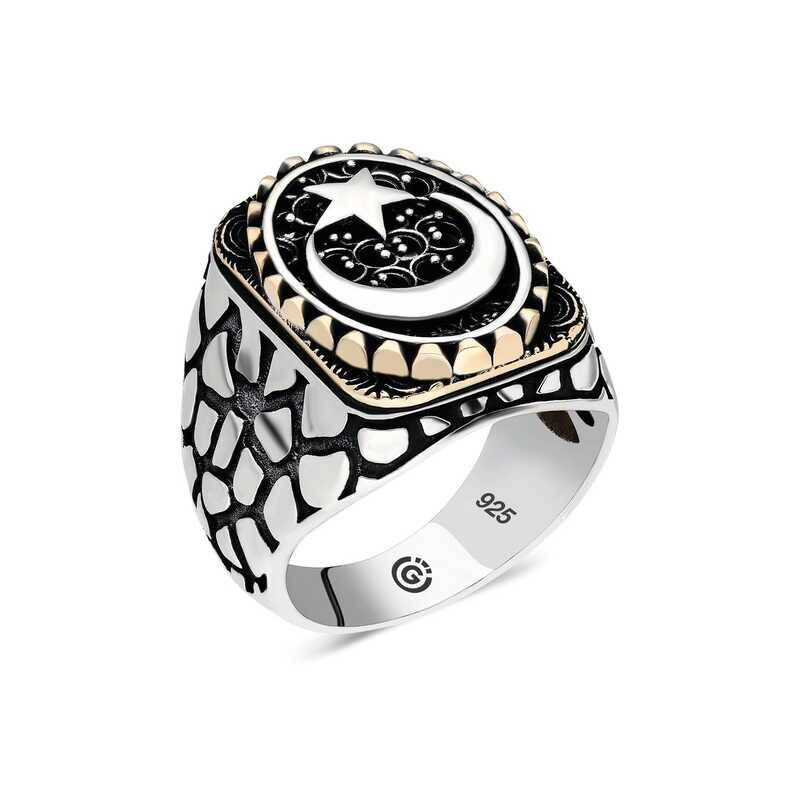 Silver Crescent Star Oval Men's Ring The crescent star oval men's ring model on silver is a stylish accessory that you can use at any time of the day. You can gift this ring to yourself or your loved ones on your birthday, Father's Day or special occasions. The crescent star oval men's ring model is made of 925 sterling silver. Oxide coating is applied to the silver. Oxide coating preserves its shine for a long time. As with all men's rings, the silver crescent star oval men's ring model is handmade. Due to silver and precious stones, there may be a ± 10% deviation from the average product weight.Width: 1.50 cmLength: 2.00 cmAverage Weight: 16 gr.