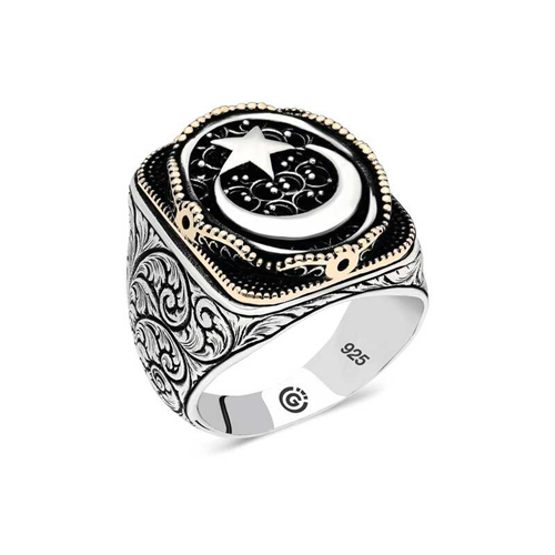 Silver Crescent Star Oval Men's Ring The crescent star oval men's ring model on silver is a stylish accessory that you can use at any time of the day. You can gift this ring to yourself or your loved ones on your birthday, Father's Day or special occasions. The crescent star oval men's ring model is made of 925 sterling silver. Oxide coating is applied to the silver. Oxide coating preserves its shine for a long time. As with all men's rings, the silver crescent star oval men's ring model is handmade. Due to silver and precious stones, there may be a ± 10% deviation from the average product weight.Width: 1.50 cmLength: 2.00 cmAverage Weight: 16 gr.
