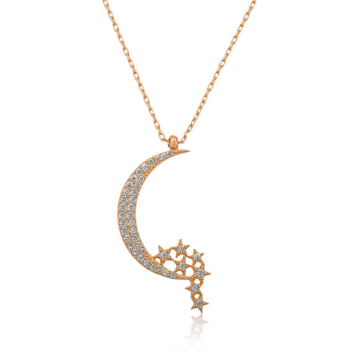 Silver Crescent Star Women's Necklace We know that the Turkish flag takes its inspiration from the blood of martyrs and the crescent and star reflected in the bloodbath. This is an unmissable opportunity to carry the sacred meaning of the flag on your skin and share it with your loved ones. Made of 925 sterling silver. Rose plating is applied to the silver. Necklace models with rose plating preserve their shine for a long time and oxidation is delayed. The stones on it are zircon. Like all crescent star women's necklace models, the crescent star women's necklace is also handmade. Due to silver and precious stones, there may be ± 10% deviation in the average product weight. Width: 2.00 cm Length: 2.00 cm Average Weight: 2.39 gr. Chain Length: 45 cm