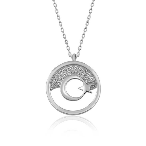 Silver Crescent Star Women's Necklace We know that the Turkish flag takes its color from the blood of martyrs and its inspiration from the crescent and star reflected in the bloodbath. This is an unmissable opportunity to carry the sacred meaning of the flag on your skin and share it with your loved ones. The crescent star necklace is made of 925 sterling silver. Rhodium plated silver. Rhodium plated necklace models preserve their shine for a long time and oxidation is delayed. As with all necklace models, the crescent star women's necklace is produced by hand. The stones on it are zircon. Due to silver and precious stones, there may be ± 10% deviation in the average product weight. Width: 1.70 cm Length: 1.70 cm Avg. Weight: 2.35 gr. Chain Length: 45 cm