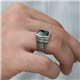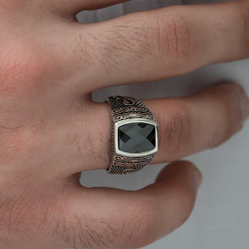 Silver Cut Stone Patterned Men's Ring We offer the highest quality and stylish men's jewelry with new models to men. Why not a nice ring to impress a woman? The silver black cut stone men's ring model is specially handcrafted. You can be happy to wear this stylish silver men's ring on your finger and give it to your friends as a gift. This stylish ring model is made of 925 sterling silver. Oxide coating is applied on the silver. Oxide coating gives silver men's rings an authentic look. Like all silver men's ring models, the cut stone patterned men's ring model is produced entirely by hand. Due to silver and precious stones, there may be a ± 10% deviation in the average product weight. Width: 1.20 cm Length: 1.40 cm Average Weight: 10.15 gr.