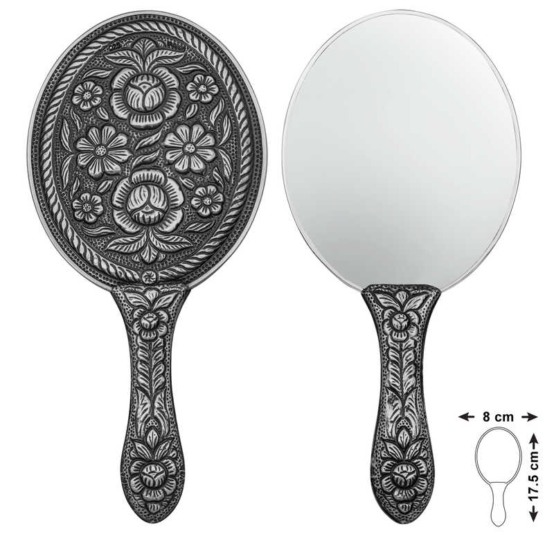 Silver Daisy and Rose Motif Hand Mirror Our products are the most beautiful silver accessories that you can gift to you and your loved ones. With their unique eye-catching designs, they are suitable for carrying in your bag. The product will be sent in a gift package... All of our products are handmade. and due to precious stones, there may be ± 5% deviation in product weight. Mirror Width: 8 cm Mirror Length: 17.50 cm Average Weight: 98 gr