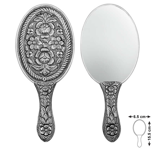 Silver Daisy and Rose Motif Hand Mirror Our products are the most beautiful silver accessories that you can gift to you and your loved ones. With their unique eye-catching designs, they are suitable for carrying in your bag. The product will be sent in a gift package... All of our products are handmade. and due to precious stones, there may be ± 5% deviation in product weight. Mirror Width: 6.50 cm Mirror Length: 15.50 cm Average Weight: 64 gr
