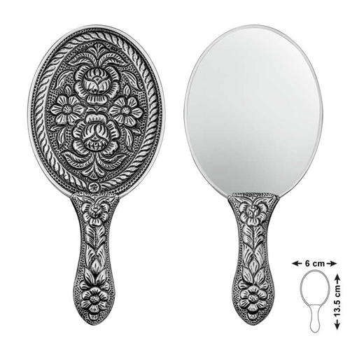 Silver Daisy and Rose Motif Hand Mirror Our products are the most beautiful silver accessories that you can gift to you and your loved ones. With their unique eye-catching designs, they are suitable for carrying in your bag. The product will be sent in a gift package... All of our products are handmade. and due to precious stones, there may be ± 5% deviation in product weight. Mirror Width: 6 cm Mirror Length: 13.50 cm Average Weight: 51 gr
