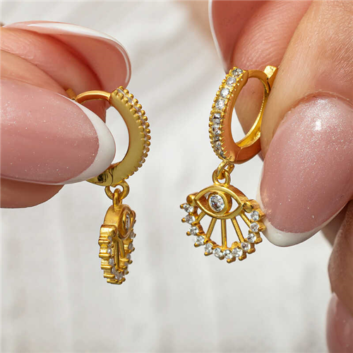 Silver Dangling Gold Eye Earrings for WomenFlowers, which are among the gifts to be given on special occasions, this time find meaning with silver earrings. Silver women's earrings crafted with the highest quality, brightest, and most sparkling stones, are for those who want to express their love once again. The earring model that expresses the clarity and purity of the mind; It is made of 925 sterling silver. Gold plated on silver. Gold plated silver earrings preserve their shine for a long time and oxidation is delayed. Like all women's silver earrings, the silver eye earring model is produced by hand. The stones on it are zircon. Due to silver and precious stones, there may be a ± 10% deviation in the average product weight.Earring Width: 1 cmEarring Length: 2 cmAverage Weight: 2.20 gr.