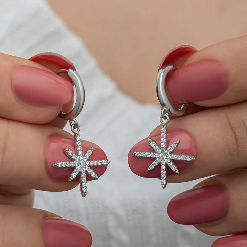 Silver Dangling Pole Star Women's EarringsOur collection includes different earring models that can adapt to the style of women of all ages, and uniquely designed earring models are waiting for you. The earring designed using the pole star figure will blow your mind. A model suitable for daily use, the earring is with you at all times. You will love using the dazzling silver pole star earrings. You will definitely find the right earring for both yourself and your loved ones in this collection. Silver pole star earrings are made of 925 sterling silver. Rhodium plated silver. Rhodium plated silver women's earrings preserve their shine for a long time and oxidation is delayed. The stones on them are zircon. Like all silver women's earrings, this silver dangling pole star earring model is also hand-crafted. Due to silver and precious stones, there may be a ± 10% deviation in the average product weight.Width: 1.50 cmLength: 2.90 cmAverage Weight: 3.50 gr.