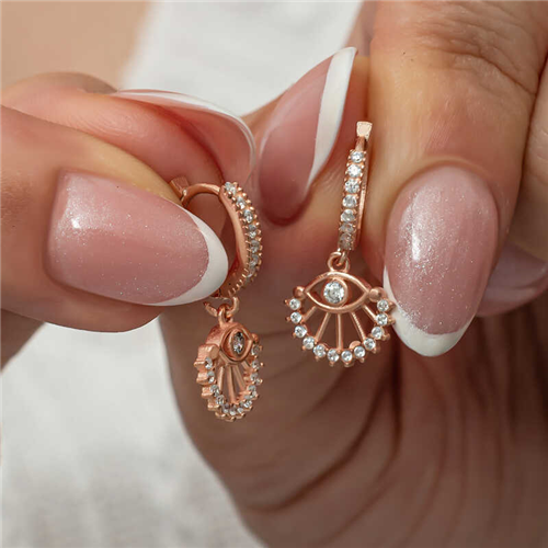 Silver Dangling Rose Eye Women's EarringsFlowers, which are among the gifts to be given on special occasions, this time find meaning with silver earrings. Silver women's earrings crafted with the highest quality, brightest, most sparkling stones, are for those who want to express their love once again. The earring model that expresses the clarity and purity of the mind; It is made of 925 sterling silver. Rose plated on silver. Rose plated silver earrings preserve their shine for a long time and oxidation is delayed. Like all women's silver earrings, the silver eye earring model is produced by hand. The stones on it are zircon. Due to silver and precious stones, there may be a ± 10% deviation in the average product weight.Earring Width: 1 cmEarring Length: 2 cmAverage Weight: 2.20 gr.