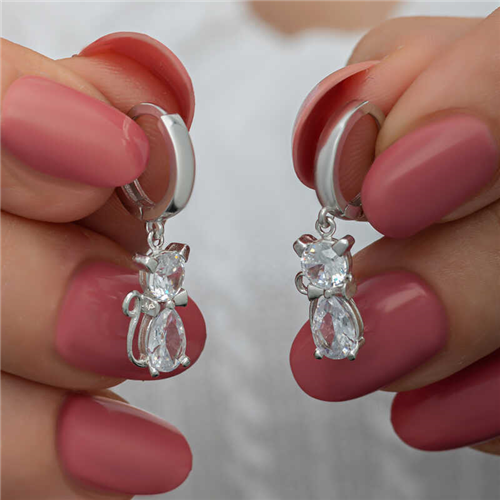 Silver Dangling Cat Woman EarringsWe designed our sweetest, warm, lovely friends cats for you. This stylish earring model with its sparkling and different design is made of 925 sterling silver. Rhodium plated on silver. Rhodium plated silver earrings preserve their shine for a long time, oxidation is delayed. The stone on the silver dangling cat woman earring is zircon. As with all silver women's earrings, the entire silver dangling cat woman earring is handmade. Due to silver and precious stones, there may be ± 10% deviation in the average product weight.Earring Width: 0.80 cmEarring Length: 1.20 cm Avg. Weight: 3.70 g