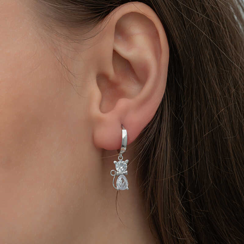 Silver Dangling Cat Woman EarringsWe designed our sweetest, warm, lovely friends cats for you. This stylish earring model with its sparkling and different design is made of 925 sterling silver. Rhodium plated on silver. Rhodium plated silver earrings preserve their shine for a long time, oxidation is delayed. The stone on the silver dangling cat woman earring is zircon. As with all silver women's earrings, the entire silver dangling cat woman earring is handmade. Due to silver and precious stones, there may be ± 10% deviation in the average product weight.Earring Width: 0.80 cmEarring Length: 1.20 cm Avg. Weight: 3.70 g