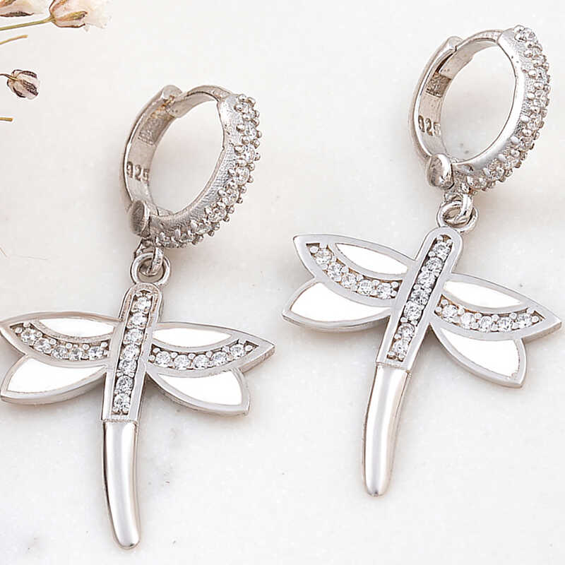 Silver Dangling Dragonfly Women's EarringsThe dragonfly is the symbol of devotion, loyalty, monogamy... The dragonfly does not give up on its love despite death... By nature, after the male and female dragonfly mate, the male dragonfly dies. After mating, the female feeds on the male's head. Even knowing that death will come in the end, the male dragonfly mates with a single female throughout its life and never gives up... This earring was designed with inspiration from this beauty that smells of sadness and loyalty... This wonderful earring is a great option for a birthday gift, a Valentine's Day gift or on special occasions. This stylish design is made of 925 sterling silver. The silver is rhodium plated. Rhodium plated silver women's earrings preserve their shine for a long time and oxidation is delayed. The white stones on the earrings are zircon. Like all women's silver earrings, the silver dragonfly dangling earrings are also handmade. Due to silver and precious stones, there may be a ± 10% deviation in the specified product weight.Earring Width: 2.00 cmEarring Length: 2.30 cmAverage Weight: 4.50 gr.