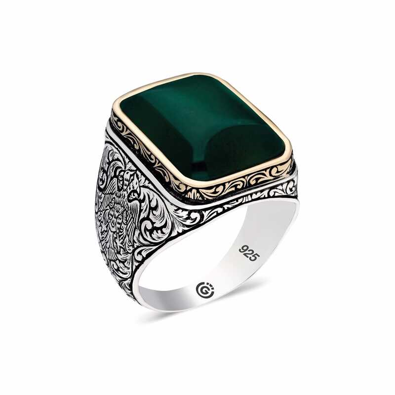 Silver Dark Green Agate Stone Square Men's RingThis men's ring model, made of Dark Green Agate stone on silver, is a stylish accessory that you can use at any time of the day. You can gift this ring to yourself or your loved ones on your birthday, Father's Day or special occasions. The Dark Green Agate stone men's ring model is made of 925 sterling silver. Oxide coating is applied on the silver. Oxide coating preserves its shine for a long time. As with all men's rings, the silver Green Agate stone men's ring model is handmade. Due to silver and precious stones, there may be a ± 10% deviation from the average product weight.Average Weight: 17.00 gr.