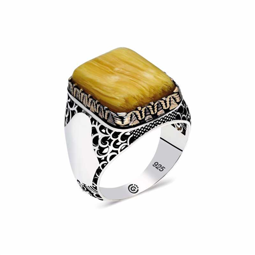 Silver Square Men's Ring with Dark Yellow Pressed Amber StoneThis men's ring model, made of Dark Yellow Pressed Amber stone on silver, is a stylish accessory that you can use at any time of the day. You can gift this ring to yourself or your loved ones on your birthday, Father's Day or special occasions. Dark yellow amber stone men's ring model is made of 925 sterling silver. Oxidized silver is coated. Oxidized silver men's rings preserve their shine for a long time. As with all men's rings, the silver Square Men's Ring with Dark Yellow Pressed Amber Stone is also produced by hand. Due to silver and precious stones, there may be a ± 10% deviation from the average product weight.Average Weight: 17.00 gr.