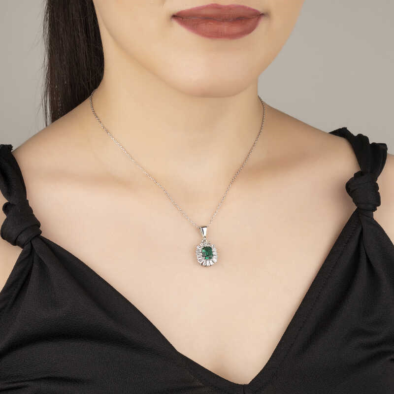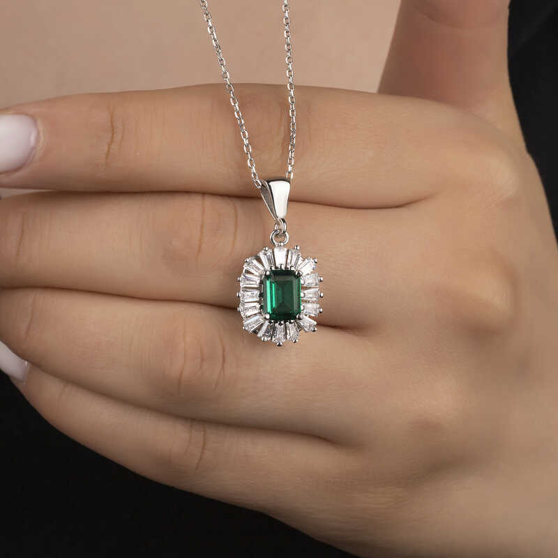 Silver Diamond Mounted Emerald Stone Women's Necklace Jewelry that has been the symbol of your image for centuries is presented to you in specially designed collections. Reflect your style with silver necklace models that are with you at every moment, from your daily life to your special occasions. Start revealing the creative originality that speaks to your soul with these different, eye-catching designs. It is now very easy to stand out with your interesting style in every environment you enter with the silver necklace types that will make your dream combinations come true. Emerald colored stone women's necklace is made of 925 sterling silver and rhodium plated. All of our silver necklace models are produced by hand. Due to silver and precious stones, there may be a ± 10% deviation in the average product weight. Width: 1.40 cm Length: 1.50 cm Chain Length: 45 cm Average Weight: 4.00 gr.