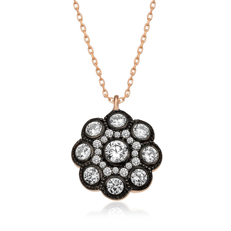 Silver Diamond Mounted Flower Women's Necklace Silver diamond mounting design necklaces, reflecting sparkle and ostentation, aim to add elegance to your style. Modernly designed silver diamond mounting flower patterned necklaces will highlight your feminine elegance. These necklaces integrate with your beauty both in daily use and at special occasions, revealing eye-catching elegance. Diamond elegance continues to convey love, passion and vitality at all ages and in all places. Beautiful silver necklaces that evoke admiration with their showiness or highlight feminine refinement with their simply elegant design are waiting for you. Rose plating is applied to silver. Rose plated silver women's necklace models preserve their shine for a long time and oxidation is delayed. The stones on the silver necklace model are zircon. The average length of the silver chain is 45 cm. This diamond-mounted flower necklace is handmade. Due to silver and precious stones, there may be a ± 10% deviation in the specified product weight. Width: 1.50 cm Length: 1.50 cm Average Weight: 3.00 gr.