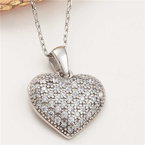 Silver Domed Heart Women's Necklace The heart symbol has always been the symbol of unconditional love and passion. In religious teachings, the power of the heart is limitless. Because the heart is the house of the Creator and our gateway to reality that opens to the universe. This stylish silver domed heart necklace is a perfect option for a birthday gift, Valentine's Day gift or a gift for mothers on special occasions. The silver domed heart women's necklace is made of 925 sterling silver. This necklace is rhodium plated. Rhodium-plated silver women's necklace models preserve their shine for a long time. The stones on it are zircon. As with all our silver women's necklace models, the silver domed heart women's necklace model is handmade. Due to silver and precious stones, there may be ± 10% deviation in the average product weight. Width: 1.30 cm Length: 1.30 cm Chain Length: 45 cm Avg. Weight: 2.90 gr.