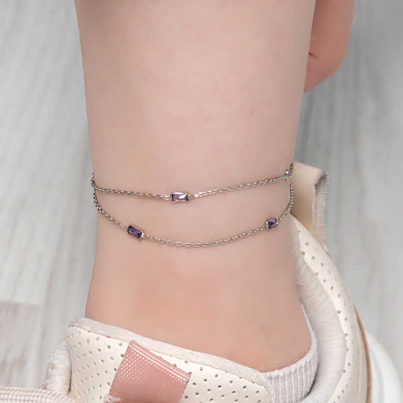 Silver Double Chain Square Lilac Stone AnkletAlthough women are usually thought of when jewelry is mentioned, it has influenced both men and women throughout history. Jewelry, worn by women to appear more elegant and attractive and by men for style, not only represents social status, personality, beliefs, and identity, but also has various functions. In Anatolia, women working in vineyards, gardens, and fields could easily find their young children's locations thanks to the sound made by anklets they wore on their feet. Anklets were also used to deter poisonous animals such as snakes and scorpions from approaching thanks to the sound they made. Today, they are worn by women who want to look elegant and stylish. Don't deprive your wrists of this elegance and visit our anklet section to choose your favorite model. The double chain square lilac stone anklet is made of 925 sterling silver. The silver is rhodium plated. Rhodium-plated women's anklets preserve their shine for a long time, transforming the silver color to rhodium and delaying oxidation. All of our products are handmade. Due to silver and precious stones, there may be a ±10% deviation in product weight.Anklet Zircon Stone Width: 0.30 cmAnklet Zircon Stone Length: 0.50 cmAnklet Chain Length: 27 cmAverage Weight: 2.80 gr.