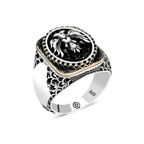 Silver Double-Headed Eagle Oval Men's Ring The double-headed eagle oval men's ring model on silver is a stylish accessory that you can use at any time of the day. You can gift this ring to yourself or your loved ones on your birthday, Father's Day or special occasions. The double-headed eagle oval men's ring model is made of 925 sterling silver. Oxide coating is applied to the silver. Oxide coating preserves its shine for a long time. Like all men's rings, the silver double-headed oval men's ring model is handmade. Due to silver and precious stones, there may be a ± 10% deviation from the average product weight.Width: 1.50 cmLength: 2.00 cmAverage Weight: 16 gr.