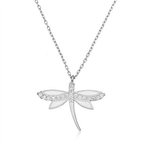 Silver Dragonfly Women's Necklace The dragonfly is the symbol of devotion, loyalty, monogamy... The dragonfly does not give up on its love despite death... By nature, after the male and female dragonfly mate, the male dragonfly dies. Even knowing that death will eventually come, the male dragonfly mates with a single female throughout its life and never gives up... The necklace was designed with inspiration from this beauty that smells of sadness and loyalty... This elegant necklace is a wonderful necklace that can be preferred as a birthday gift, Valentine's Day gift or on special occasions. This stylish design is made of 925 sterling silver. Rhodium plated silver. Rhodium plated necklaces preserve their shine for a long time. The stones on the necklace are zircon. Like all women's silver necklaces, the silver dragonfly women's necklace is produced by hand. Due to silver and precious stones, there may be a ± 10% deviation in the specified product weight. Width: 2.20 cm Length: 1.90 cm Chain Length: 45.00 cm Average Weight: 1.70 gr.