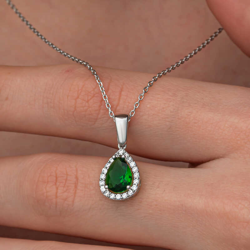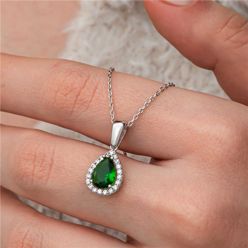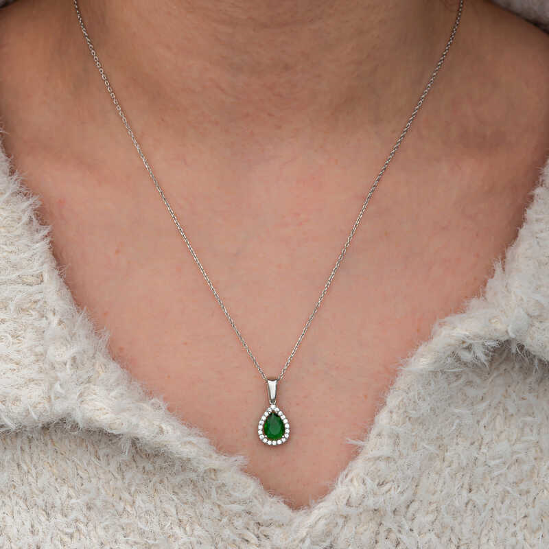 Silver Drop Emerald Stone Women's Necklace Bringing together elegance and the fascinating green tones of nature, this special necklace dazzles with its drop-cut emerald colored stone. The shiny zircons surrounding the stone add an elegant sparkle to the necklace, while its 925 sterling silver chain completes the elegance. While it offers simple elegance in daily use, it stands out as a bold accessory on special occasions. Combining modern and classic styles, this necklace is an ideal choice to gift your loved ones or to pamper yourself. This elegant design that meets the nobility of green will add elegance to your style! Rhodium plated silver. Rhodium-plated silver women's necklace models preserve their shine for a long time. Like all women's necklaces, the silver zircon drop stone women's necklace model is also hand-made. Due to silver and precious stones, there may be a ± 10% deviation from the average product weight. Necklace Width: 1.00 cm Necklace Length: 2.00 cm Chain Length: 45 cm Average Weight: 2.50 gr