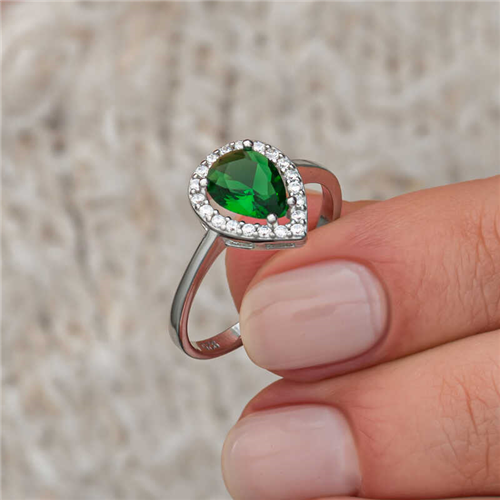 Silver Drop Emerald Stone Women's Ring Reflecting the elegant and strong green tones of nature, this special ring combines the fascinating beauty of the drop-cut emerald stone with 925 sterling silver. The sparkling zircon stones surrounding the stone give the ring a sophisticated sparkle while its design combines classic and modern lines. This ring, which will complete your elegance in daily use or be a glamorous detail on special occasions, can also be preferred as a meaningful gift for your loved ones. Rhodium plated silver. Rhodium plated silver ring models preserve their shine for a long time and oxidation is delayed. Like all silver rings, the silver zircon stone women's ring model is produced entirely by hand. Due to silver and precious stones, there may be a ± 10% deviation in the average product weight. Ring Width: 1.00 cm. Ring Length: 1.10 cm. Average Weight: 2.00 gr.
