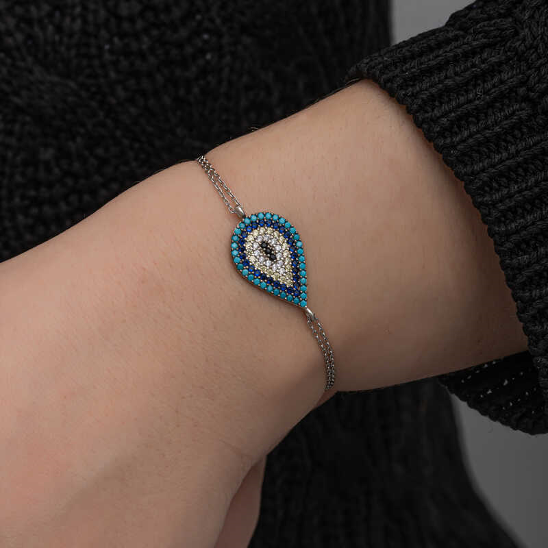 Silver Drop Evil Eye Women's BraceletFor many years, people have used the evil eye bead to protect themselves from evil gazes. The evil eye bead is a precaution against the negative effects of evil gazes on people. For this reason, people wear evil eye bead to protect their loved ones. This evil eye bracelet reflects elegance and style. You can choose this model, which has always been popular and does not compromise on its elegance, as a birthday gift, Valentine's Day gift, or a gift for mothers on special occasions. The silver evil eye women's bracelet is made of 925 sterling silver. Rhodium plated silver. Rhodium plated silver women's bracelets preserve their shine for a long time and delay oxidation. The stones on it are zircon. Like all silver women's bracelets, this silver evil eye women's bracelet model is produced entirely by hand. Due to silver and precious stones, there may be a ± 10% deviation in the average product weight.Evil Eye Bracelet Width: 1.50 cmEvil Eye Bracelet Length: 2.70 cmBracelet Length: 20 cmAverage Weight: 3.60 gr.