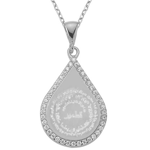 Silver Drop Kıtmir Prayer Women's Necklace The Kıtmir prayer is used both to ward off the evil eye and for those who have been affected by it in any way. It is also stated in the hadiths that the evil eye is real and that with its effects, it can put a person in their grave and a camel in a cauldron. The Prophet's statement, "If there was anything that could change fate, it would be the evil eye," is an extremely important statement about the effects of the evil eye. The most well-known method to protect against these effects is to recite a prayer for the evil eye or carry it with us. If you want to protect your loved ones from the evil eye and express the value you give them, it will be one of the best gifts you can give them. This specially designed necklace model is made of 925 sterling silver. The silver is rhodium plated. Rhodium-plated silver women's necklace models preserve their shine for a long time and oxidation is delayed. The white stones on the necklace are zircon. Like all of our products, the silver drop Kitmir prayer necklace is also handmade. Due to silver and precious stones, there may be a ± 10% deviation from the average product weight. Necklace Width: 1.80 cm Necklace Length: 2.30 cm Average Weight: 4.80 gr. Chain Length: 45 cm
