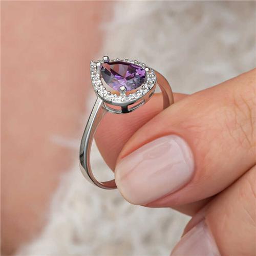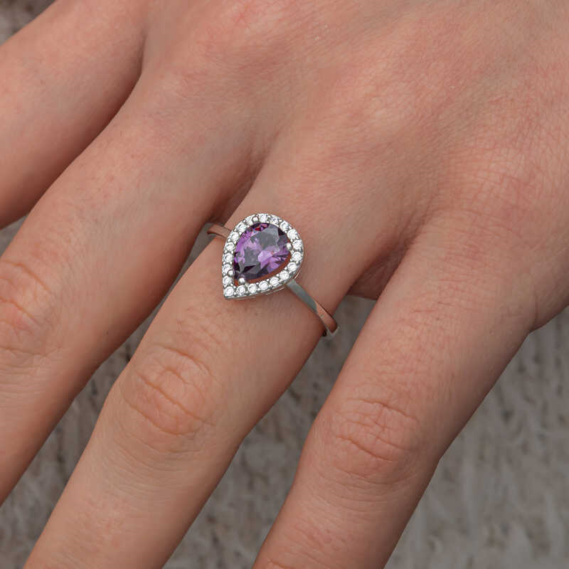 Silver Drop Purple Stone Women's Ring This special ring, which stands out with its elegant design and enchanting color, combines the dazzling sparkle of the drop-cut purple stone with 925 sterling silver. The shiny zircon details surrounding the stone add a sophisticated touch to the design. Ideal for both daily use and special occasions, this ring is an indispensable piece for women who want to reflect their elegance in a simple and impressive way. It is an elegant and meaningful gift option for yourself or your loved ones. Designed with the nobility of purple, this stylish ring will add a glamorous touch to your style! The silver is rhodium-plated. Rhodium-plated silver ring models preserve their shine for a long time and oxidation is delayed. Like all silver rings, the silver zircon stone women's ring model is produced entirely by hand. There may be a ± 10% deviation in the average product weight due to silver and precious stones. Ring Width: 1.00 cm. Ring Length: 1.10 cm. Average Weight: 2.00 gr.