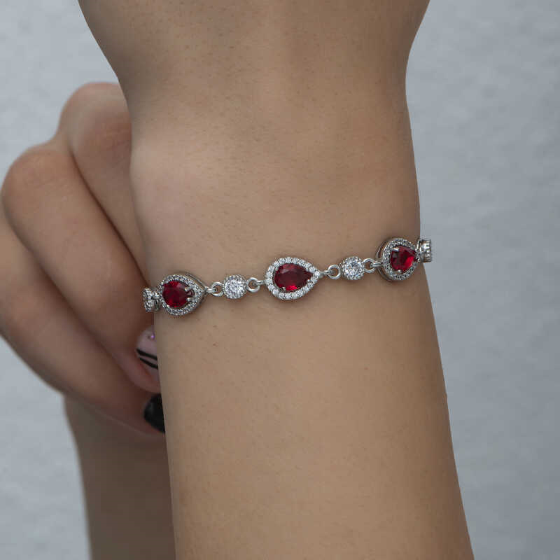 Silver Drop Red Stone Waterway Women's BraceletYou will love using this bracelet, which resembles stars with its sparkling white and aquamarine stones, in everyday life, special occasions and nights. The timeless drop waterway silver bracelet, which appeals to all women who want to achieve a stylish look, is waiting for you. The silver drop waterway women's bracelet is a perfect option for a birthday gift, Valentine's Day gift or as a gift for mothers on special occasions. The silver drop waterway women's bracelet is made of 925 sterling silver. Rhodium plated on silver. Rhodium plated women's bracelets preserve their shine for a long time and oxidation is delayed. Like all women's bracelets, the silver drop waterway women's bracelet is produced by hand. Due to silver and precious stones, there may be a ± 10% deviation in the average product weight.Drop Width: 0.80 cmDrop Length: 1.00 cmChain Length: 23 cmAverage Weight: 5.80 gr.