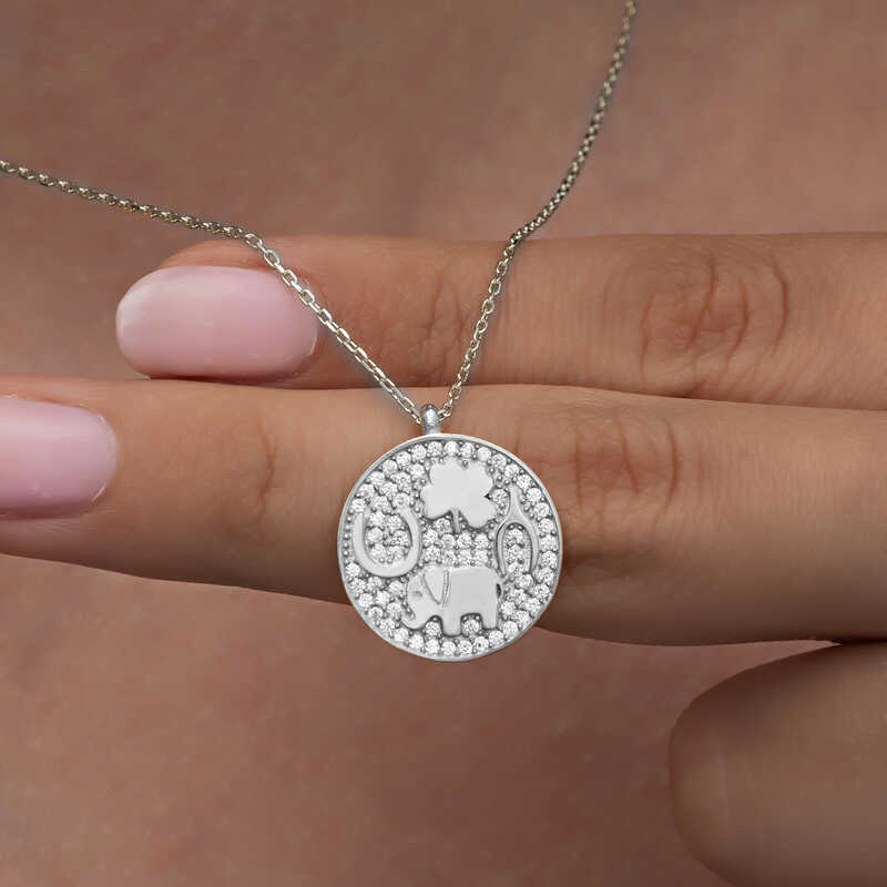Silver Elephant Motif Luck Women's Necklace The women's necklace model adorned with silver zircon stones is a wonderful design that you can enjoy using and gifting to your loved ones. The women's luck necklace with elephant motif is made of 925 sterling silver. Rhodium plating is applied on the silver necklace. Rhodium-plated silver women's necklaces preserve their shine for a long time and oxidation is delayed. The average silver chain length is 45 cm. All stones on it are zircon. Like all silver women's necklace models, the silver elephant motif women's luck necklace is also handmade. Due to silver and precious stones, there may be a ± 10% deviation in the average product weight. Necklace Diameter: 1.80 cm Chain Length: 45 cm Average Weight: 3.40 gr