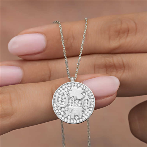 Silver Elephant Motif Luck Women's Necklace The women's necklace model adorned with silver zircon stones is a wonderful design that you can enjoy using and gifting to your loved ones. The women's luck necklace with elephant motif is made of 925 sterling silver. Rhodium plating is applied on the silver necklace. Rhodium-plated silver women's necklaces preserve their shine for a long time and oxidation is delayed. The average silver chain length is 45 cm. All stones on it are zircon. Like all silver women's necklace models, the silver elephant motif women's luck necklace is also handmade. Due to silver and precious stones, there may be a ± 10% deviation in the average product weight. Necklace Diameter: 1.80 cm Chain Length: 45 cm Average Weight: 3.40 gr