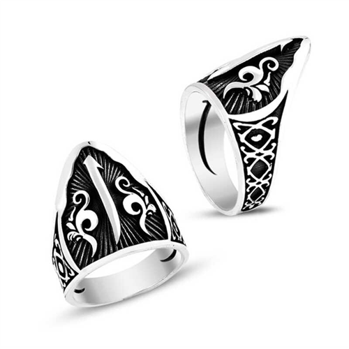 Silver Elif Motif Men's Thumb Ring Elif is the first letter of Arabic. Due to its alphabetical feature, it is not connected to any letter from the left. It combines with other letters only from the right. The letter Elif is the letter that symbolizes Allah in the Arabic alphabet. In the abjad calculation, the symbols with 1 as numbers symbolize the unity and uniqueness of Allah. The Elif is always written upright. It also points to Allah with its position from the earth to the sky... Based on these deep and beautiful meanings, we designed the men's ring model with the Arabic Elif script for yourself or your loved ones on your birthday, Father's Day or special occasions. This stylish ring is made of 925 sterling silver. Oxide coating is applied on the silver. Oxide coating gives rings an authentic appearance. As with all men's ring models, the silver Elif motif thumb men's ring model is also produced by hand. Due to silver and precious stones, there may be ± 10% deviation from the stated average product weight. Width: 2.50 cm Height: 2.30 cm Average weight: 11.60 gr.