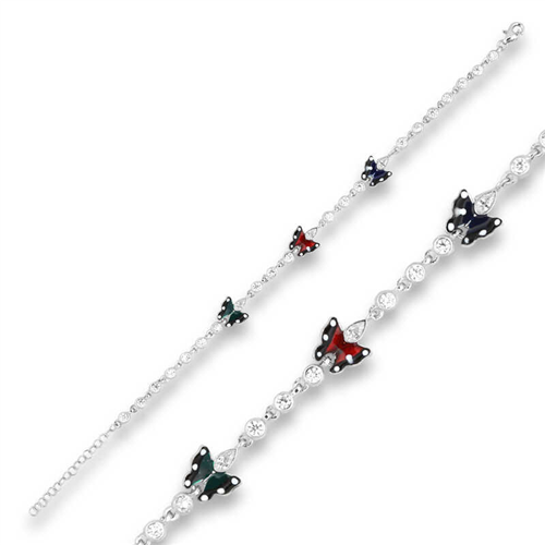 Silver Enameled Butterfly Women's BraceletThe butterfly symbol carries the value of the revival of feelings of peace, happiness, youth and romance, as well as a clean and pure love. Butterfly models, which offer an extremely elegant look and are often used by women in necklaces and bracelets, have a popular place in the Greek and Far Eastern jewelry world, representing the maturation of the body. Psychologically, butterfly models are described as the transformation and renewal of the soul. This stylish bracelet is a perfect choice for a birthday gift, Valentine's Day, or special occasions. The bracelet is made of 925 sterling silver. Rhodium-plated silver. Rhodium-plated women's bracelets preserve their shine for a long time and delay oxidation. Like all silver bracelets, this silver butterfly bracelet is handcrafted. The stones on it are zircon. Due to silver and precious stones, there may be ± 10% deviation in the specified product weight.Butterfly Width: 0.90 cmButterfly Length: 0.70 cmBracelet Length: 20.50 cmAverage Weight: 5.00 gr.