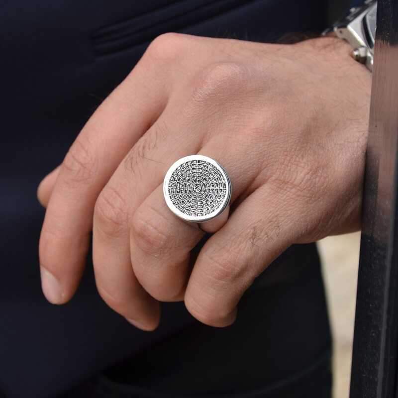 Silver Esma-ul Husna Men's Ring"Esmaü'l Husna" means the most beautiful names. In Islam, the most beautiful names belong to Allah. "So call on Him by those beautiful names." Designed based on the verse, this men's ring model with the names of Allah is a perfect option for a birthday gift, Father's Day or special occasions. Esma-ul Husna men's ring model is made of 925 sterling silver. Oxidized silver is coated. Oxidized silver men's rings have an authentic look. Like all men's rings, the silver Esmaü'l Husna men's ring model is produced entirely by hand. Due to silver and precious stones, there may be a ± 10% deviation in the average product weight.Width: 2.30 cmLength: 2.70 cmAverage Weight: 14.50 gr.