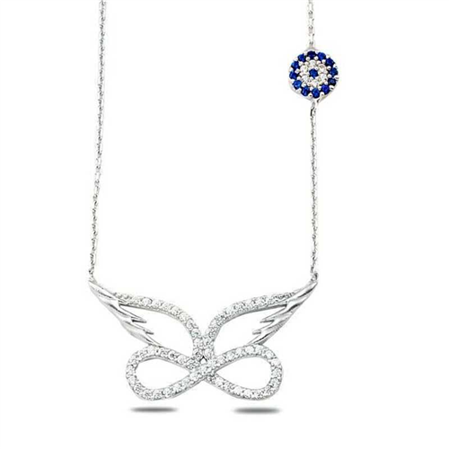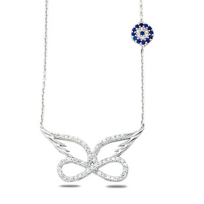 Silver Evil-Eye Angel Wing Infinity Women's Necklace One of the gifts that make a loved one the happiest is the infinity symbol necklace models. It expresses your love, passion, and loyalty that you wish to last forever. Angel wings stand out as symbols of purity and cleanliness and because of their protective meaning. Therefore, the silver evil-eye angel wing infinity women's necklace shows the recipient that they are as pure and clean as an angel and that they will be loved forever. The silver angel wing infinity women's necklace that you and your loved ones will enjoy wearing will be one of the best gifts for your loved one. This specially designed necklace is made of 925 sterling silver. The silver is rhodium plated. All silver women's necklace models with rhodium plated preserve their shine for a long time. Like all women's necklace models, the silver angel wing infinity women's necklace is produced by hand. Due to silver and precious stones, there may be ± 10% deviation in the specified product weight. Necklace Width: 2.20 cm Necklace Length: 1.40 cm Chain Length: 45 cm Average Weight: 3.00 gr.