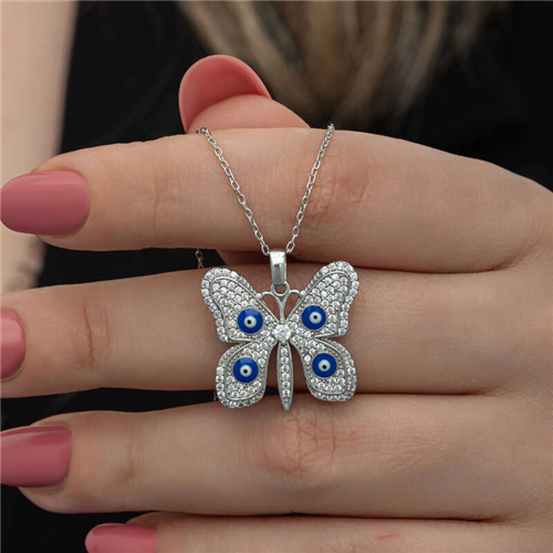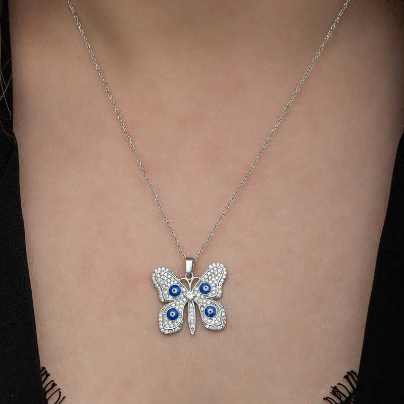 Silver Evil-Eye Butterfly Women's Necklace Butterflies, symbolizing freedom, innocence and purity, are the expression of pure love and affection. The spring butterfly necklace means that love starts with a small spark, then grows with great patience and finally expresses a declaration of love. The silver evil-eye butterfly women's necklace that you and your loved ones will enjoy wearing will be one of the best gifts. This stylish necklace model is gold-plated. Gold-plated silver women's necklace models preserve their shine for a long time and delay oxidation. The stones on it are zircon. Like all silver women's necklace models, the silver evil-eye butterfly women's necklace model is also handmade. Due to silver and precious stones, there may be a ± 10% deviation from the average product weight. Width: 2.40 cm Length: 2.40 cm Chain Length: 45 cm Average Weight: 5 gr.