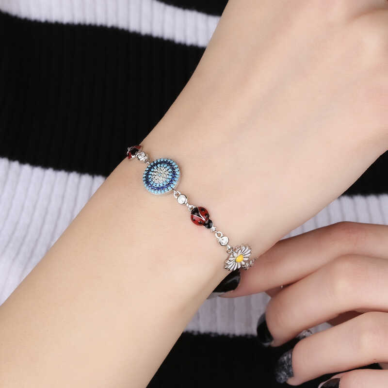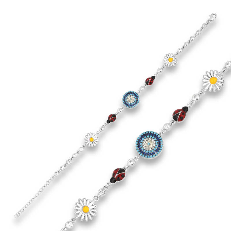Silver Evil Eye Daisy Ladybug Women's BraceletEvil eye beads have been used for many years to protect themselves from evil looks. It is a precaution against the negative effects of evil looks on people, evil eye beads… For this reason, people wear evil eye beads to protect their loved ones. Daisy flowers express the meaning of pure love. One of their most important features is that they have one on each stem. Inspired by nature, this sparkling women's bracelet is a wonderful design that you can enjoy using and can be a gift to your loved ones. Silver Evil Eye Daisy Ladybug Women's Bracelet is made of 925 sterling silver. This silver bracelet is rhodium plated. Rhodium plated products preserve their shine for a long time and delay oxidation. Like all silver products, the silver evil eye daisy ladybug women's bracelet model is also handmade. Due to silver and precious stones, there may be a ± 10% deviation in the average product weight.Evil Eye Width: 1.20 cm Evil Eye Length: 1.30 cm Bracelet Length: 20.50 cm Average Weight: 6.45 gr.