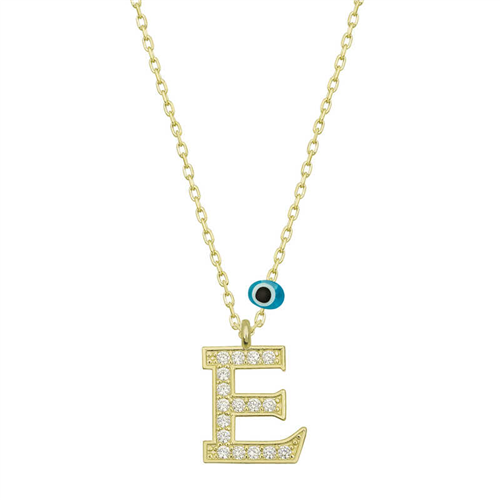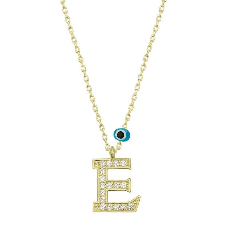 Silver Evil Eye Gold Letter E Women's Necklace With silver letter necklaces, those who are precious to you are always with you... Decorate your loved one's neck with love with this special necklace model that young lovers can choose on special occasions. A silver letter necklace that your loved ones will wear with pleasure will be one of the most meaningful gifts. The evil eye letter women's necklace model is made of 925 sterling silver. Gold plated on silver. Gold plated silver women's necklace models preserve their shine for a long time. As with all of our products, the silver women's letter necklace model is handmade. Due to silver and precious stones, there may be ± 10% deviation from the average product weight. Width: 0.80 cm Length: 1.10 cm Avg. Weight: 1.40 g