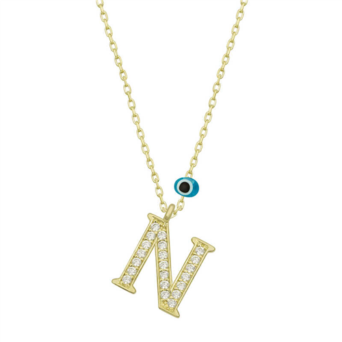 Silver Evil Eye Gold Letter N Women's Necklace With silver letter necklaces, those who are precious to you are always with you... Decorate your loved one's neck with love with this special necklace model that young lovers can choose on special occasions. A silver letter necklace that your loved ones will wear with pleasure will be one of the most meaningful gifts. The evil eye letter women's necklace model is made of 925 sterling silver. Gold plated on silver. Gold plated silver women's necklace models preserve their shine for a long time. As with all of our products, the silver women's letter necklace model is produced by hand. Due to silver and precious stones, there may be ± 10% deviation from the average product weight. Width: 0.80 cm Length: 1.10 cm Avg. Weight: 1.40 g