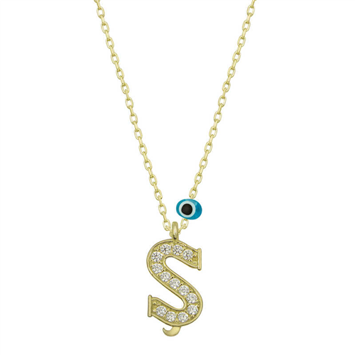 Silver Evil Eye Gold S Letter Women's Necklace With silver letter necklaces, those who are precious to you are always with you... Decorate your loved one's neck with love with this special necklace model that young lovers can choose on special occasions. A silver letter necklace that your loved ones will wear with pleasure will be one of the most meaningful gifts. The evil-eye letter women's necklace model is made of 925 sterling silver. Gold plated on silver. Gold plated silver women's necklace models preserve their shine for a long time. As with all of our products, the silver women's letter necklace model is produced by hand. Due to silver and precious stones, there may be ± 10% deviation from the average product weight. Width: 0.80 cm Length: 1.10 cm Avg. Weight: 1.40 g