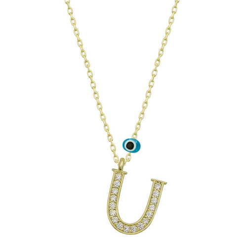 Silver Evil Eye Gold Letter U Women's Necklace With silver letter necklaces, those who are precious to you are always with you... Decorate your loved one's neck with love with this special necklace model that young lovers can choose on special occasions. A silver letter necklace that your loved ones will wear with pleasure will be one of the most meaningful gifts. The evil-eye letter women's necklace model is made of 925 sterling silver. Gold plating is done on silver. Gold-plated silver women's necklace models preserve their shine for a long time. As with all of our products, the silver women's letter necklace model is produced by hand. Due to silver and precious stones, there may be ± 10% deviation from the average product weight. Width: 0.80 cm Length: 1.10 cm Avg. Weight: 1.40 g